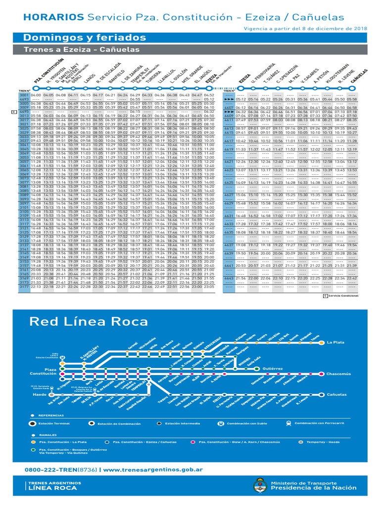 Tren roca ezeiza. La empresa Trenes Argentinos Operaciones presta servicio de tren de cercanรญas elรฉctrico entre Constituciรณn y la estaciรณn Ezeiza y servicio de tren remolcado diรฉsel entre esta รบltima y Caรฑuelas. Horarios tarifas y recorridos de trenes. 51 222 306 394 518.